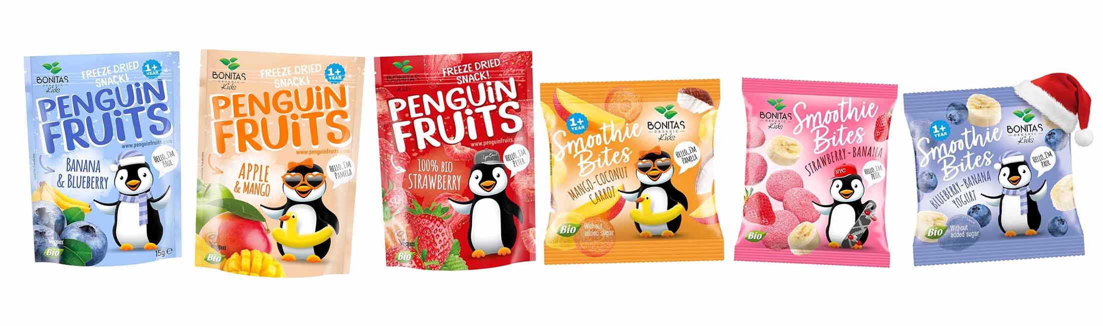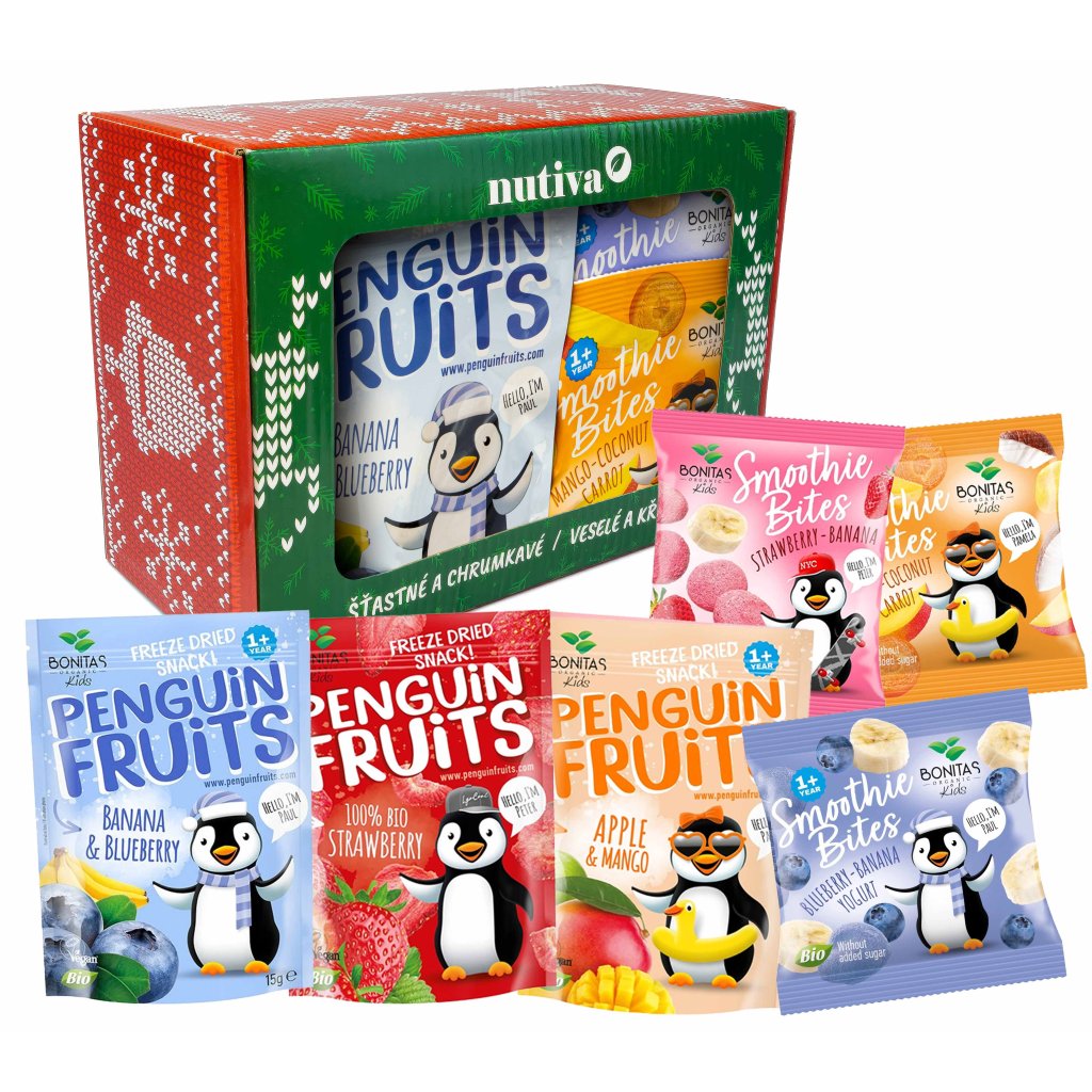 - BIO Penguin Fruits Banán & Čučoriedka BONITAS 15g – jemne sladké ovocné kúsky s čučoriedkovým osviežením.