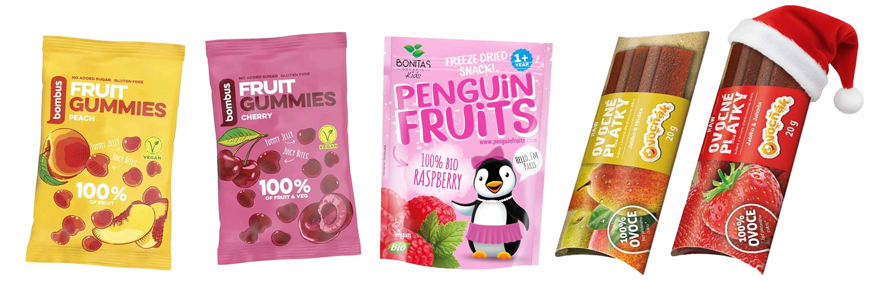 Nájdeš v ňom čisté ovocné dobroty - ovocné cukríky v príchutiach broskyňa a jahoda, BIO malinové kúsky a jablkovo-hruškové plátky bez pridaného cukru a umelých prísad, ktoré potešia každého – od malých maškrtníkov až po rodičov hľadajúcich zdravšiu alternatívu k čokoláde.