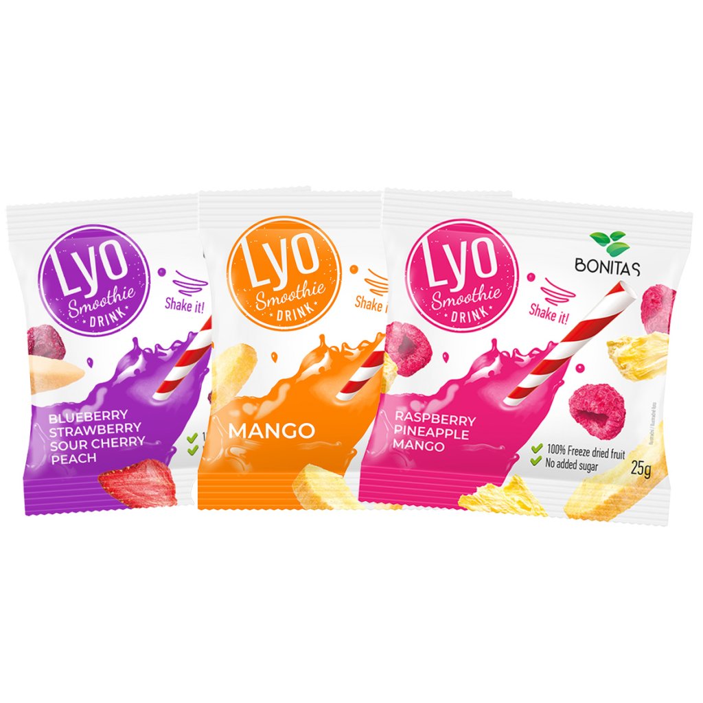 Sada Lyo Smoothie Drink je dokonalý balíček pre všetkých milovníkov zdravého životného štýlu, ktorí nechcú robiť kompromisy medzi rýchlosťou a kvalitou. Získate tri najobľúbenejšie príchute vďaka čomu môžete každý deň siahnuť po inej, 100% čistej ovocnej bombe .