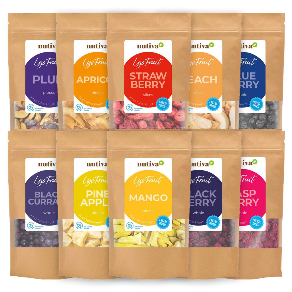 Všetky obľúbené mrazom sušené ovocie v jednom balíčku. Rozmaznajte svoje chuťové poháriky lyofilizovanými jahodami, malinami, slivkami, mangom, ananásom, broskyňami, černicami, marhuľami, čučoriedkami a čiernymi ríbezľami.