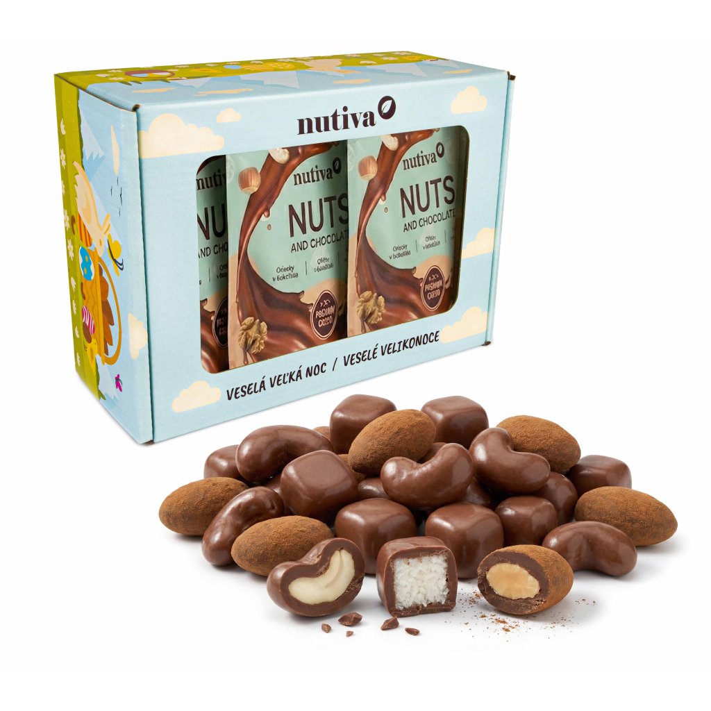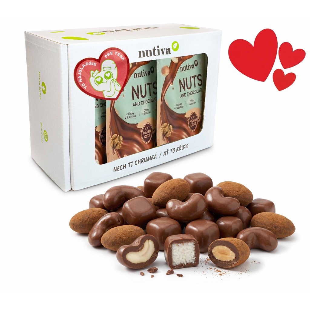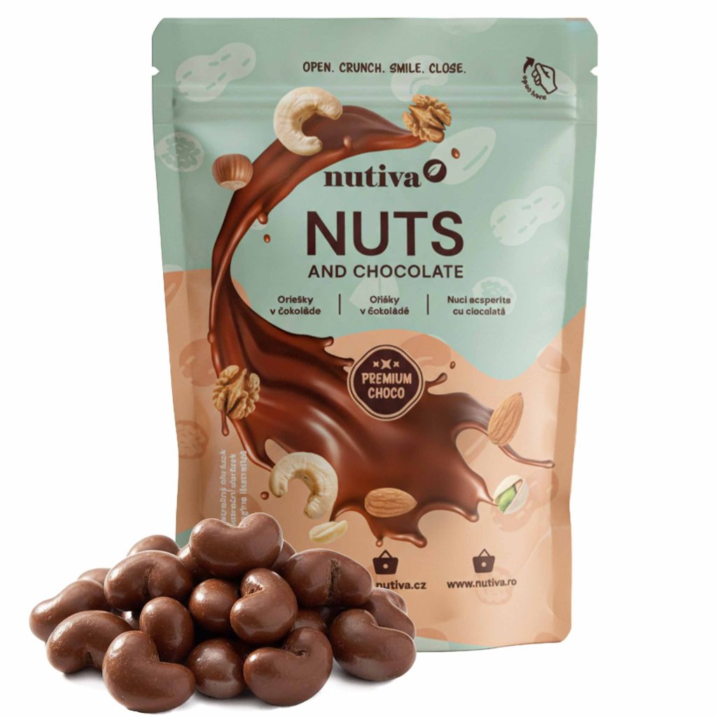 - NUTIVA Kešu v mliečnej čokoláde (200 g) – jemné maslové jadrá kešu orechov zahalené do bohatej vrstvy mliečnej čokolády.